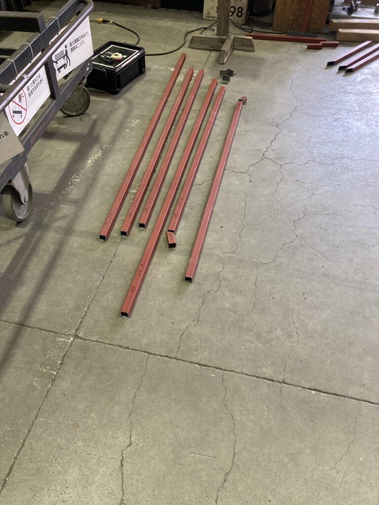 1時間かけて現場の寸法、角度を測りメモと原寸型(段ボールに書く)を持ってカインズにきました。角パイプ31*31*1.6t*5500、@4280を2本購入し早速切断加工し、バリ取りをした所です。