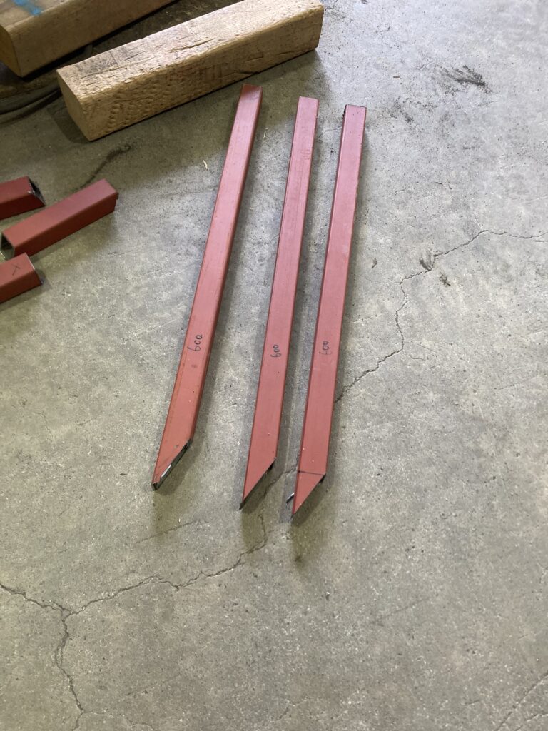 これは以前購入した長めの端材から、振れ止め用に600㎜で切断しました。角度のある方が30度ですが、高速切断機では60度までしかガイドがないのでガイドを外してマジックラインをセットして足で踏みつけ固定してから切断しました。(少しずれますしお勧めできないやり方)