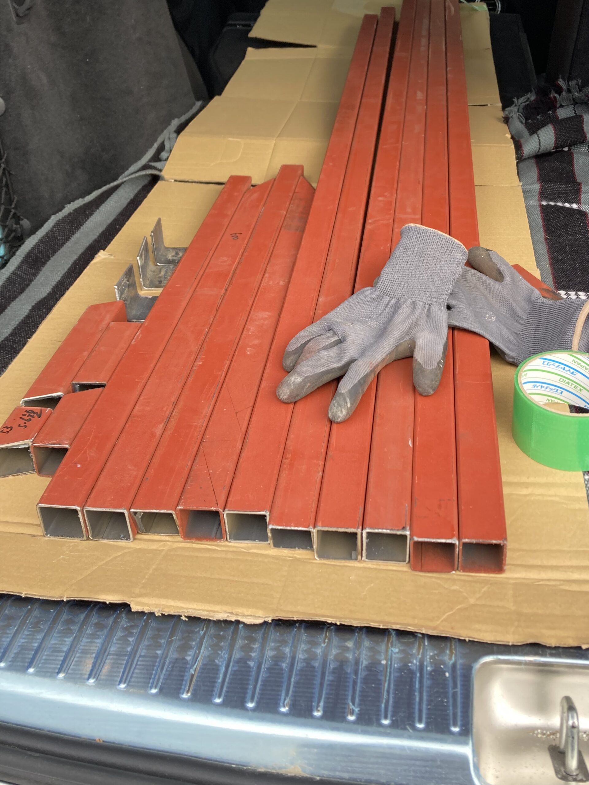 毎度の運搬車に段ボール養生してそっと積みます。この時までに切断やバリ取りで出た鉄粉が柱の中に溜まっていますので、トントンしてしっかり落としてから積みましょう。車内で落ちると掃除は厄介です。