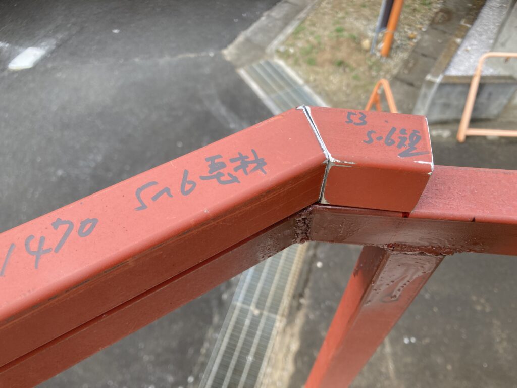 雨が降りそうで降りませんが今日の溶接は中止したので、溶接時に錆止め塗装を剥がす場所をマジックでマークして回りました。