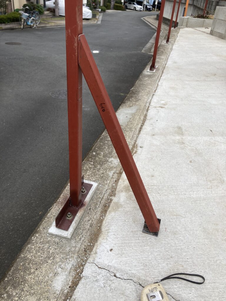 まだベースプレートの本締めをしていないこともあり、内外に揺れますが、ベース固定後にも揺れるようであればこのような感じで振れ止めを設置します。本当はネコ車の通れる幅にしてあるのでやりたくないのですが揺れては困るので。最大3箇所(1番、4番、6番)を予定しています。