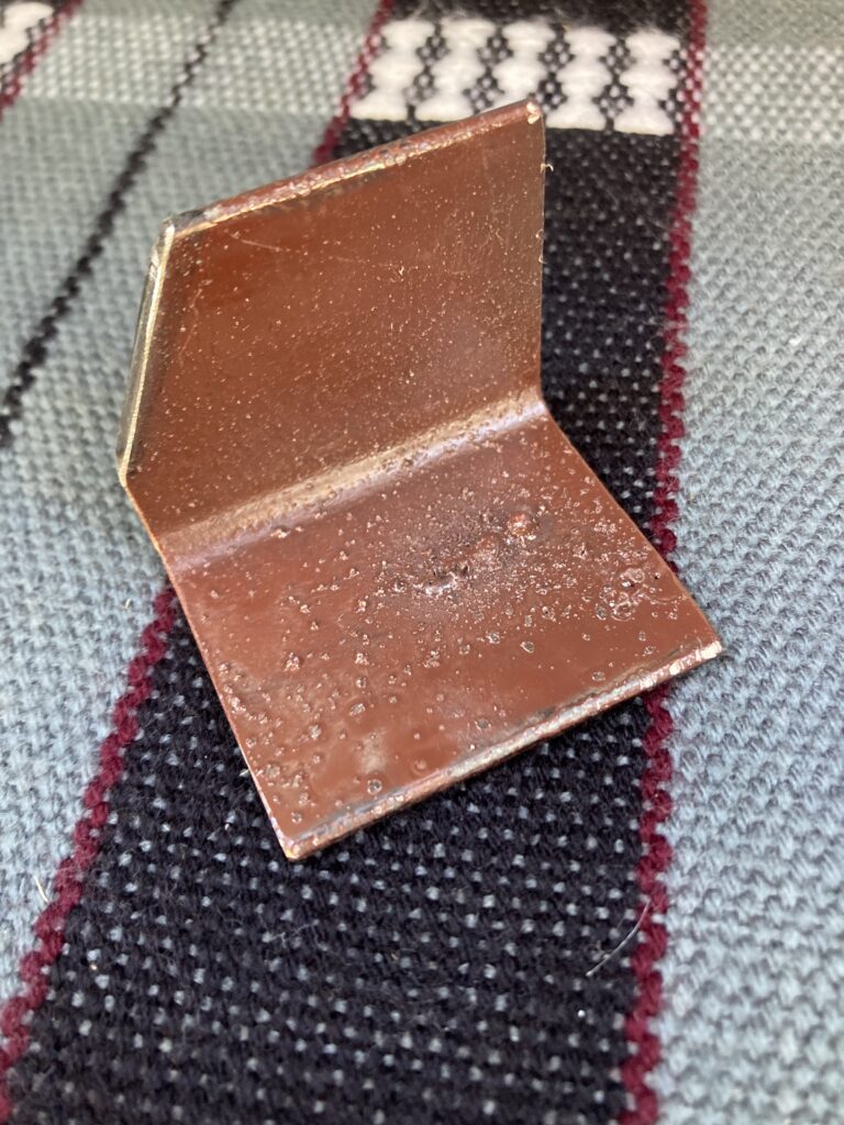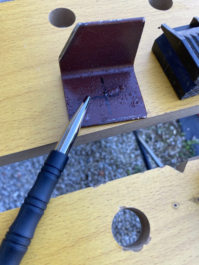 上部材の穴を小さなピースを磁石の治具で仮固定し、仮溶接後に本溶接、グラインダーで削ってから錆止めスプレーを吹いたところです。