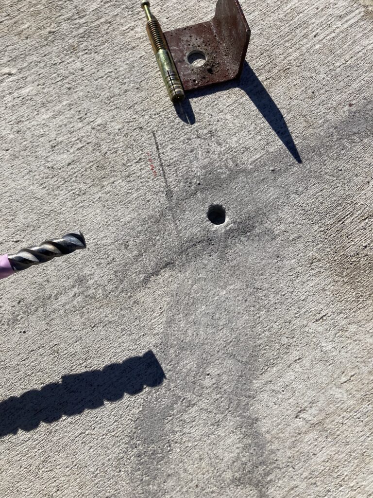 穴の空いたベースプレート用にアンカーを打つための穴を振動ドリルで開けていきます。