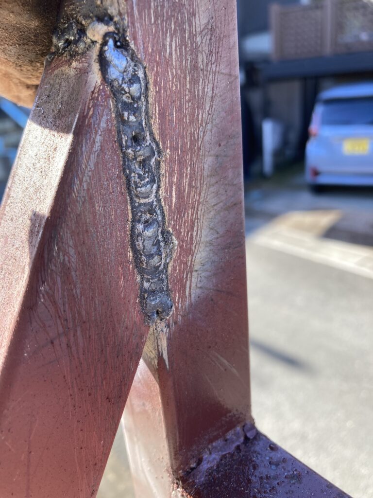 今後の作業に回すことも検討しましたが、溶接は今日で終わらせたい。1番の柱の振れ止めも位置を決めているので、治具で固定して部分溶接後に本溶接します。後日アンカーの穴が予定位置に開いてくれさえすれば良いのですが。これまでの溶接で玉が沢山出来ましたが、3回目としてはまあまあビードができ始めているので、自分では成長を感じています。なるべく近くで溶接箇所が良く見える体制を確保し、顔を近づけてゆっくりと強い素材側をメインにしてリズムを持って行ったり来たりしながら進めていく感じですね。あとは電圧ですが溶接機の設定で真ん中で試してから強ければ順に下げ、弱ければ順に上げて適正な電圧を探すことが成功の鍵。今日は45Aでやっていますので穴あきが少なくなりました。