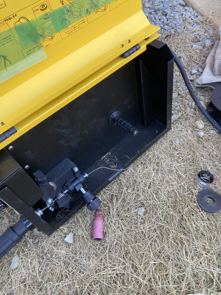 こちらは7番の上部材の穴を塞いでいる途中です。写真撮ってもう少しで溶接が完了だと思った矢先、ワイヤーが出てきません。