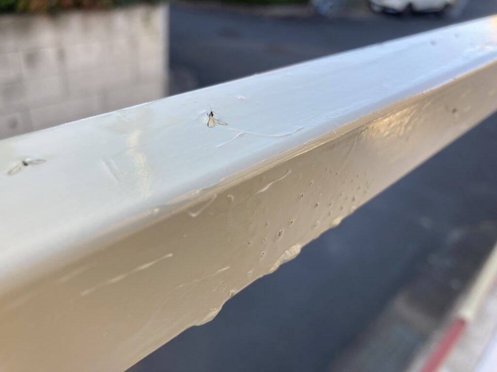 有機溶剤が好きなのか、白っぽいものが好きなのか、呼んでもいないのに小さな虫が沢山集まり塗ったばかりのペンキの上にひっついて動けなくなっています。虫を取ろうとすれば塗装面が変になるので触れません。上塗りして埋めちゃおうかな。全くどうしてくれるんだ。