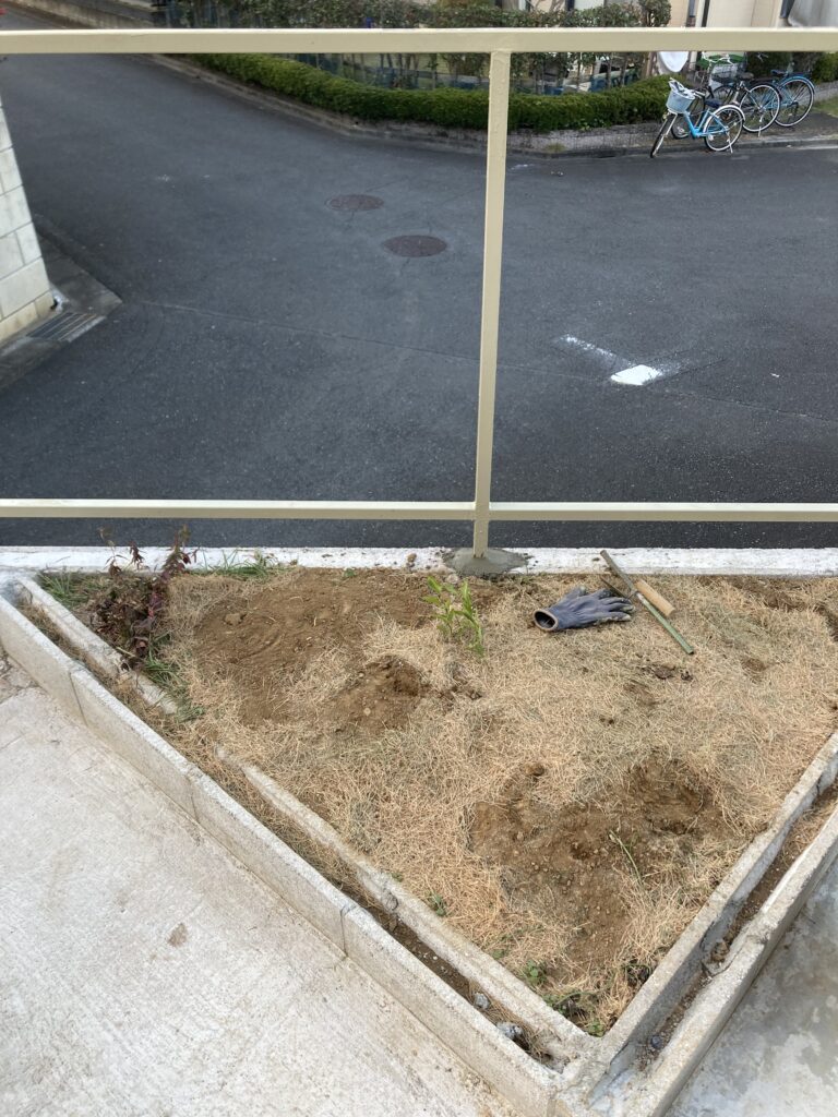 5番の宙吊りの柱の足元にモルタルを作って流し込んで棒で突きました。道路側にあふれたモルタルを整えて目地を作ります。