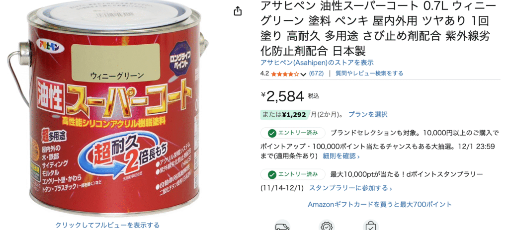 Amazonで買ったペンキです。少し前のセールで@1583円とお買い得でした。