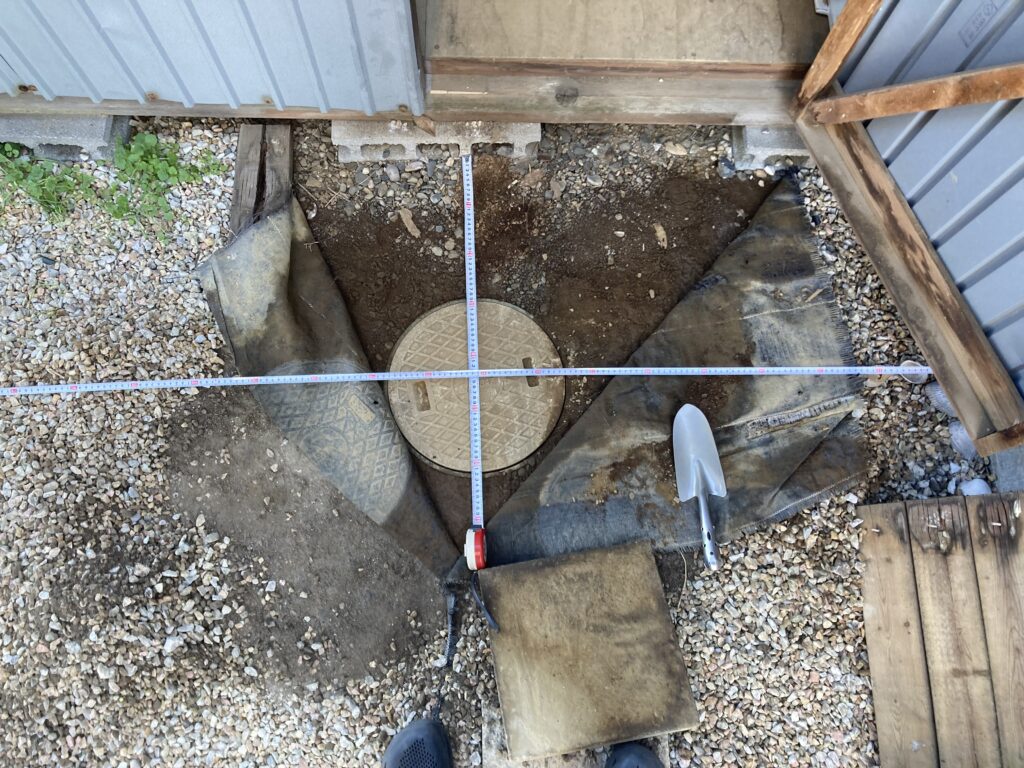こちらは20年前に作った倉庫の前部です。おそらくこの辺に雨水の浸透桝があるはずだ、と叩きながら探すとほぼ的中。敷石と防草シートをめくると浸透桝の蓋が出てきました。現在の倉庫位置から350㎜程度は離れています。倉庫を拡張する場合、倉庫の後ろの敷地が斜めになっていて少し前に出さないと後ろの角が隣地にかかってしまう可能性があります。倉庫拡張の幅は900㎜か1200㎜のどちらかで考えているのですが、その場合は150㎜から200㎜くらい前に出すことになりそうです。