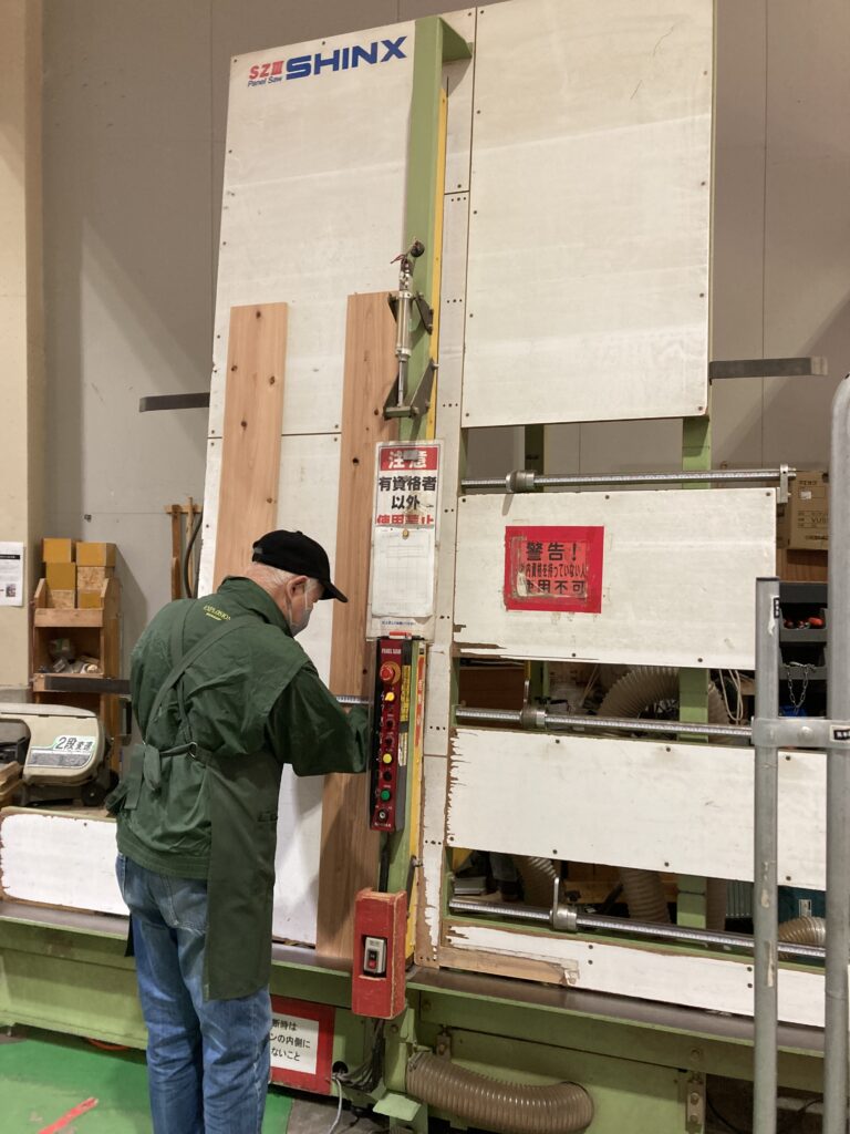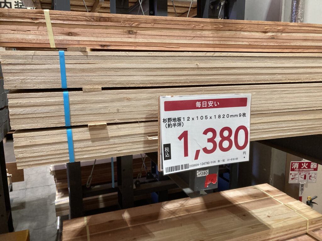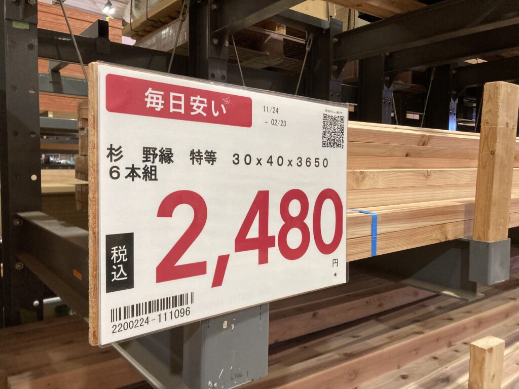 他にもいくつかの材料で迷いましたが、最終的にはカフェ板という木材にしました。2000*200*30,@1250円を2枚購入し、両端を落として3分割(63㎜)にしました。1カット50円で8カット400円です。長手方向は電動鋸ではまっすぐ切れませんので係のおじさんとノコギリの刃の厚さは3㎜とか計算しながらお願いし見守ります。