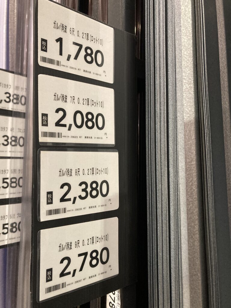そして外装の屋根材、壁面材はこれになります。屋根が傾斜していて正面は7尺を定尺で、後側は6尺を定尺で使っているのでそれぞれ2枚必要。(合わせる部分で調整だけで900でも1200でも2枚必要になる)