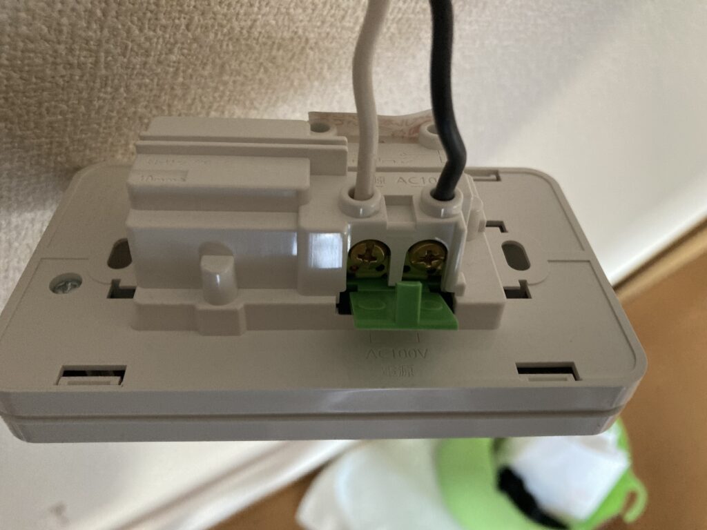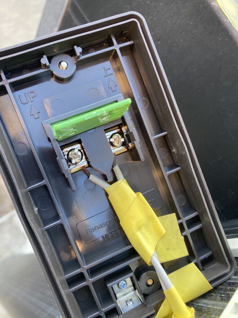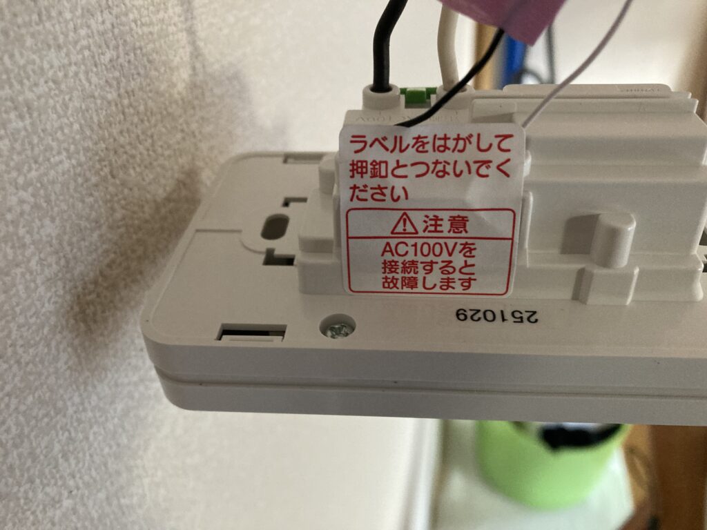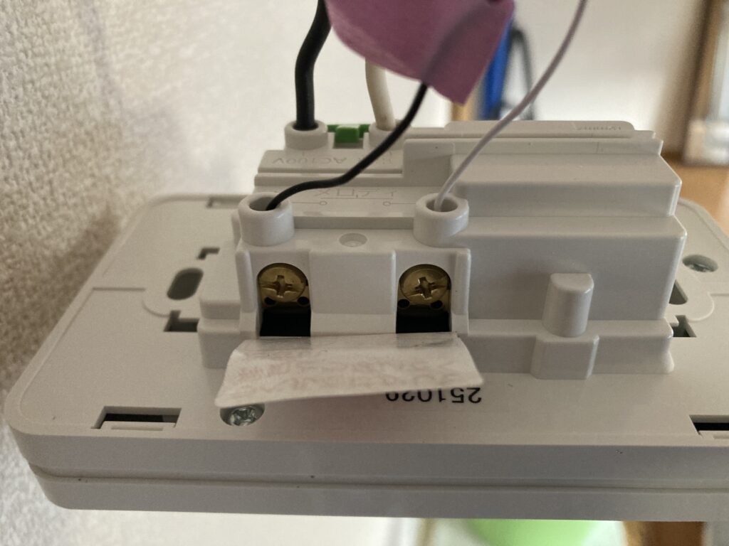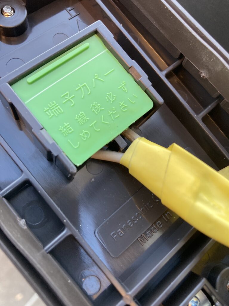これは室内側です。コンセントタイプではないので、近所の電気工事資格者にAC100Vの繋ぎ込みをお願いしました。ブレーカー落としてからネジを緩めてコードを差して締めるだけです。