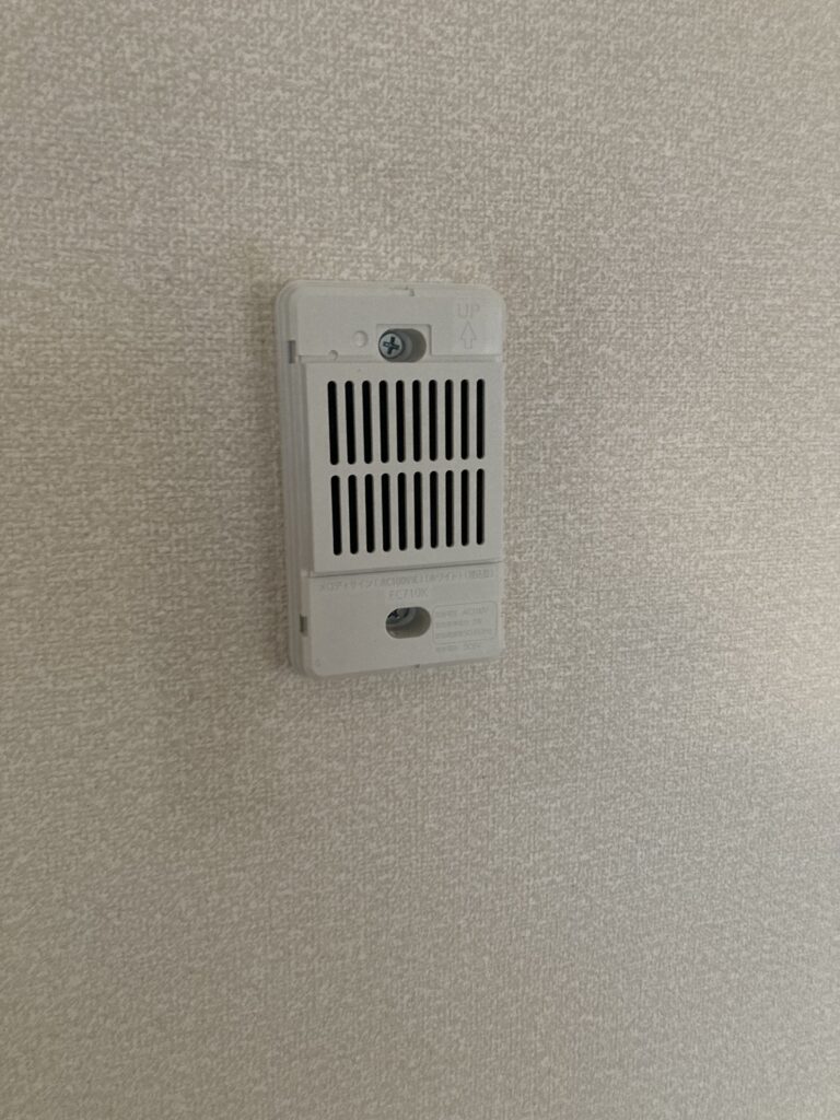 今まで壁に付いていたカメラ付きインターホンの取付金物はフック式になっており、また少し大きいので取り外しましたが、チャイムは制御部分が後ろに出っぱっているため今の通線用のみの開口では入りません。以前購入したマキタのレシプロソーで穴を少し拡大したら入るようになりましたので、本体はプラスターボードにタッピングビスで固定しました。軽いので問題なさそうです。