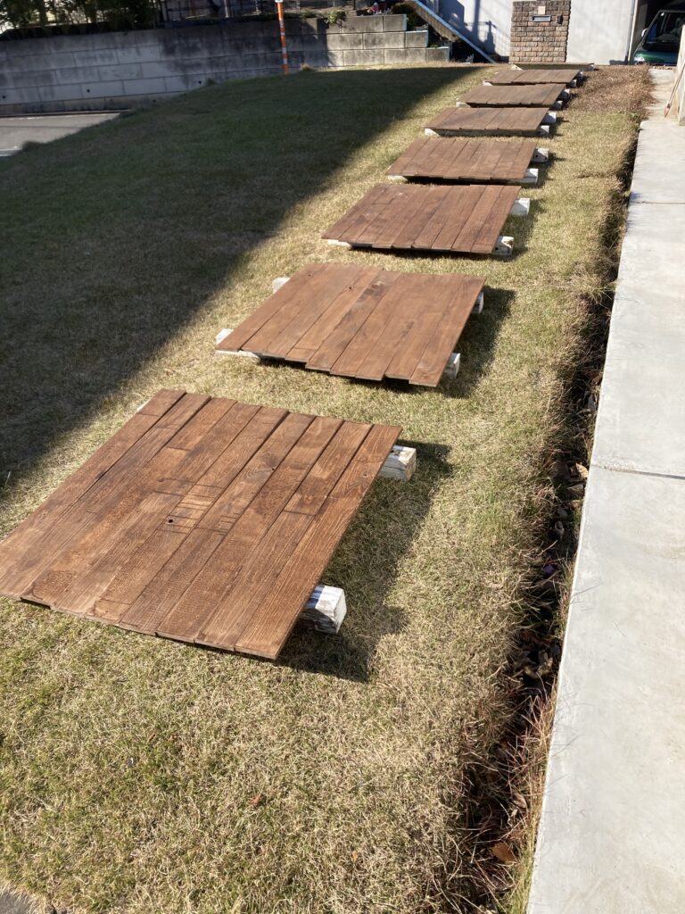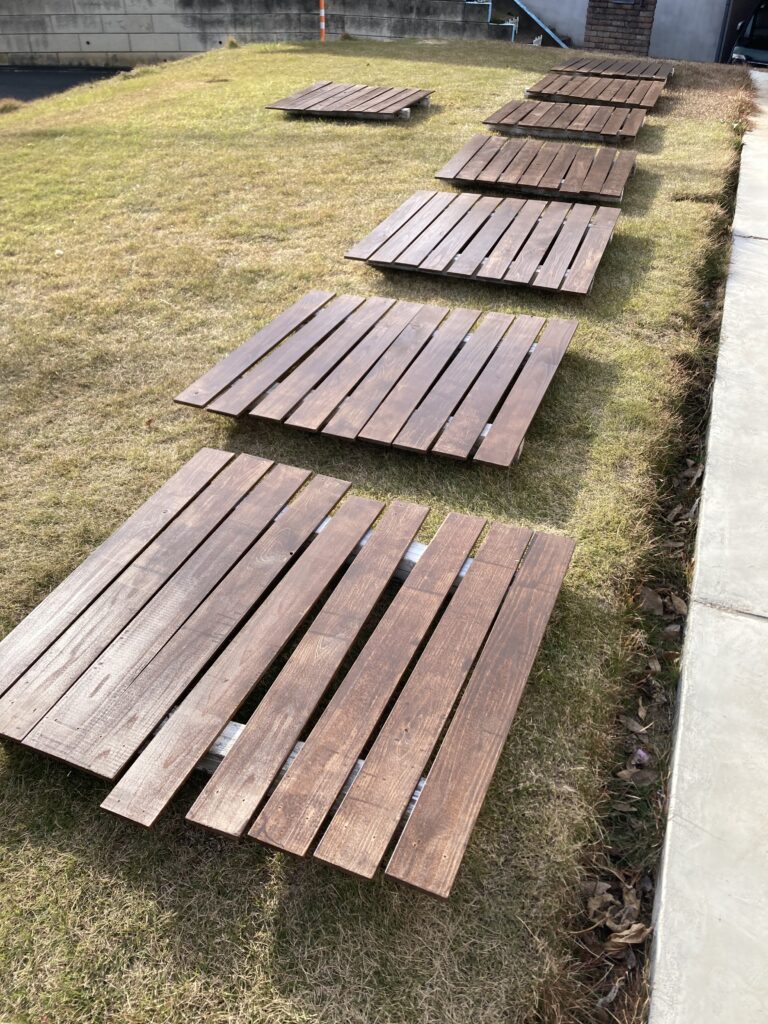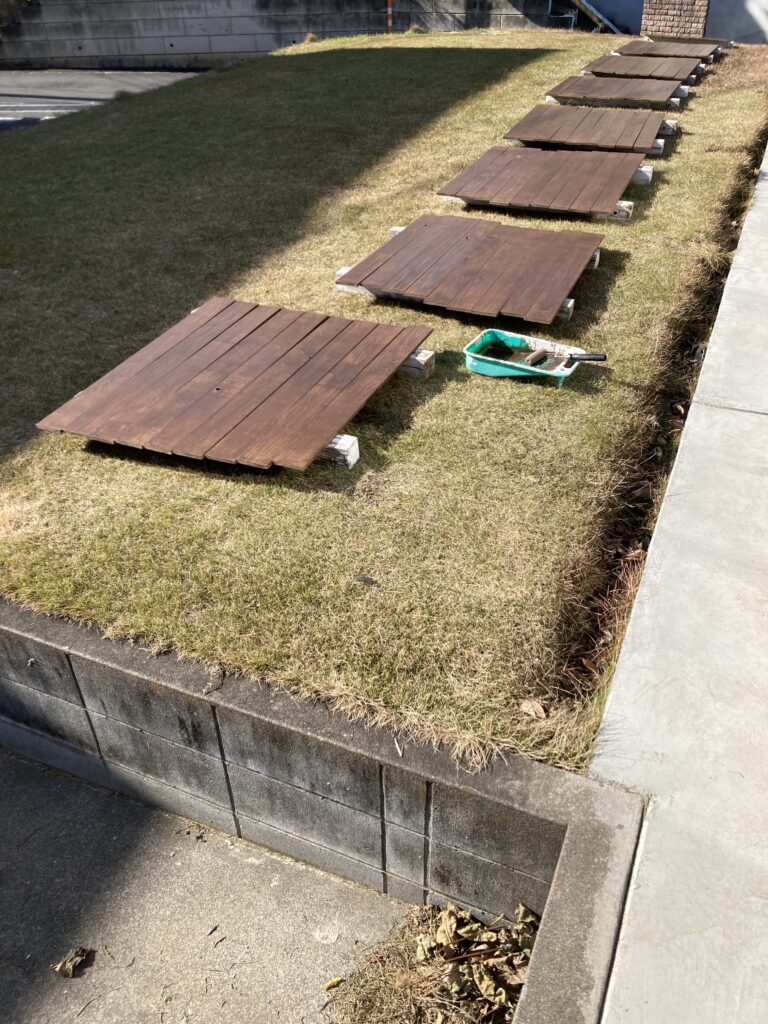 気温も上がってきたので板材を広げます。側面を塗った時の液ダレがかなり目立ちます。