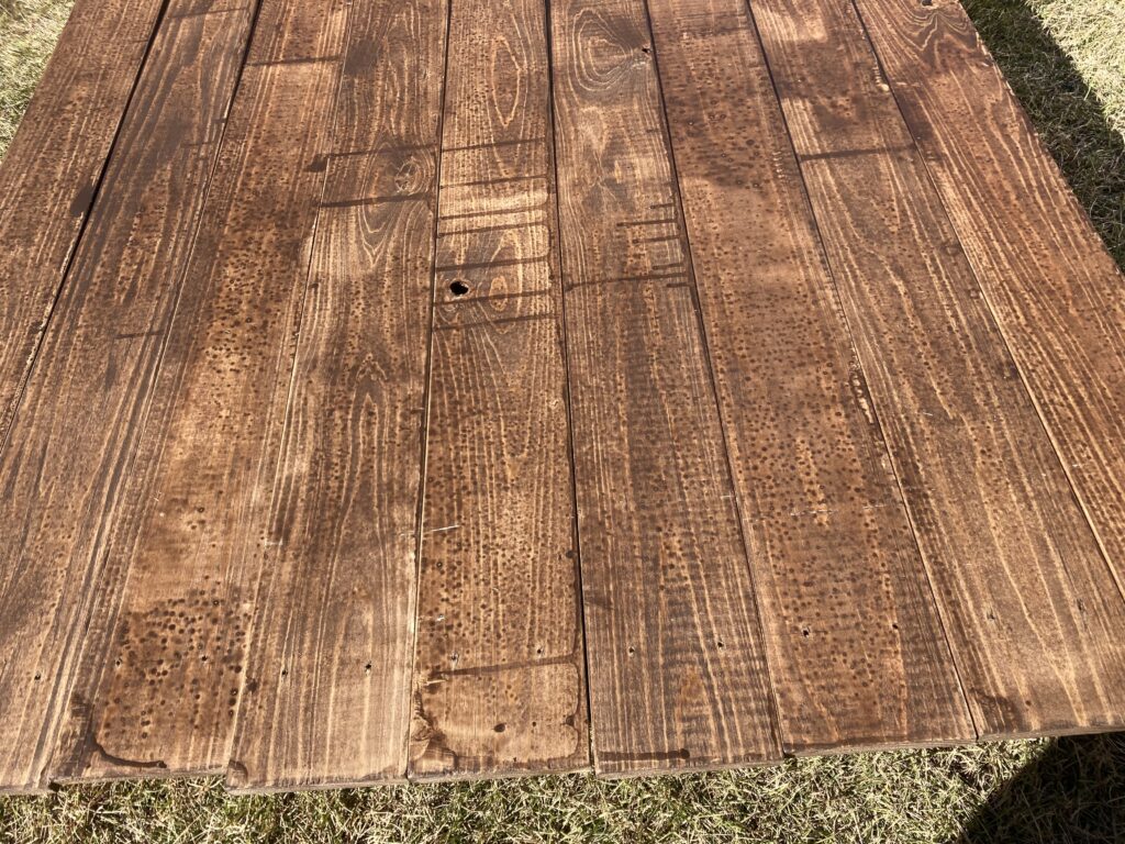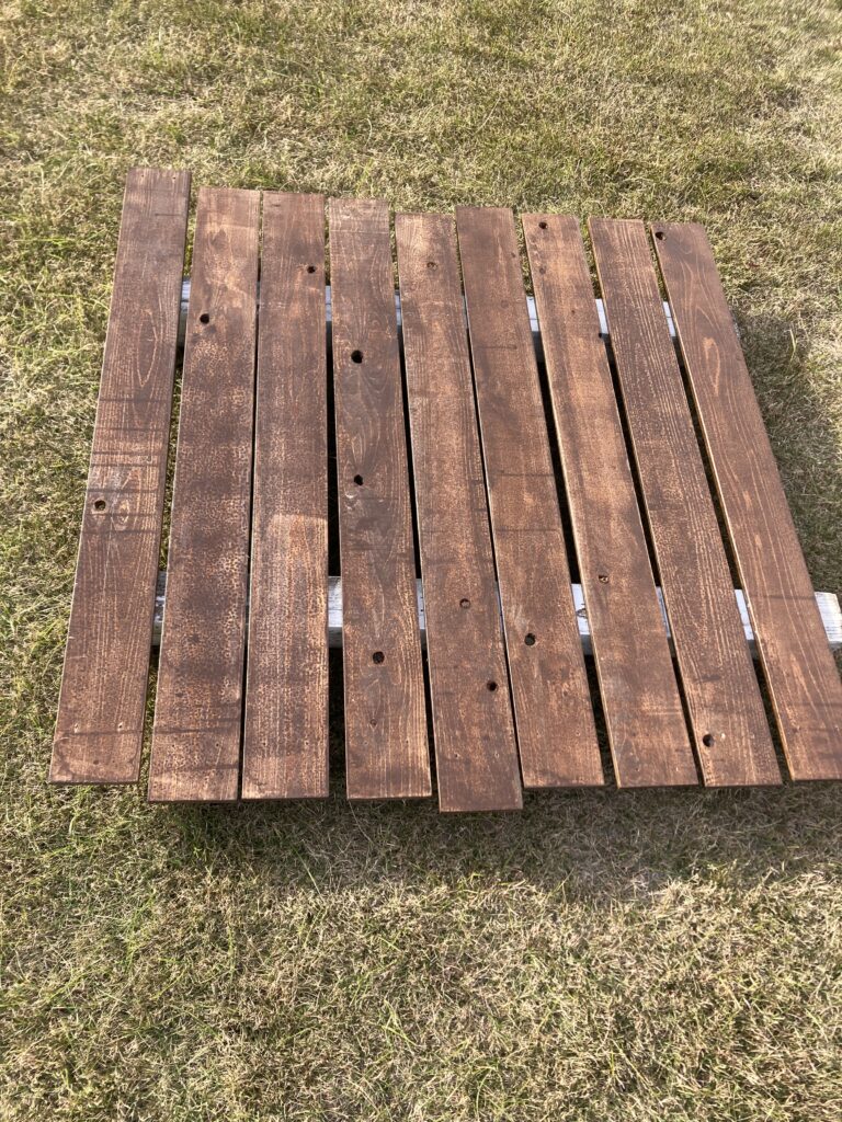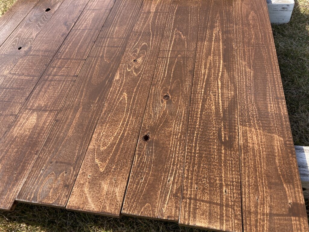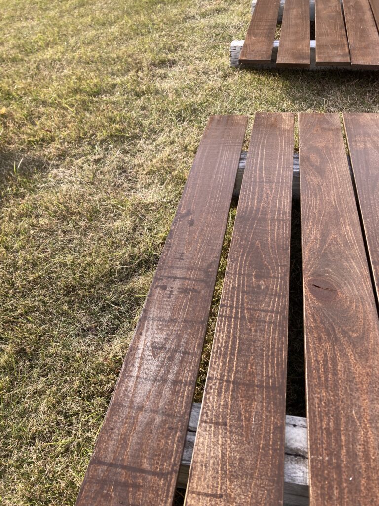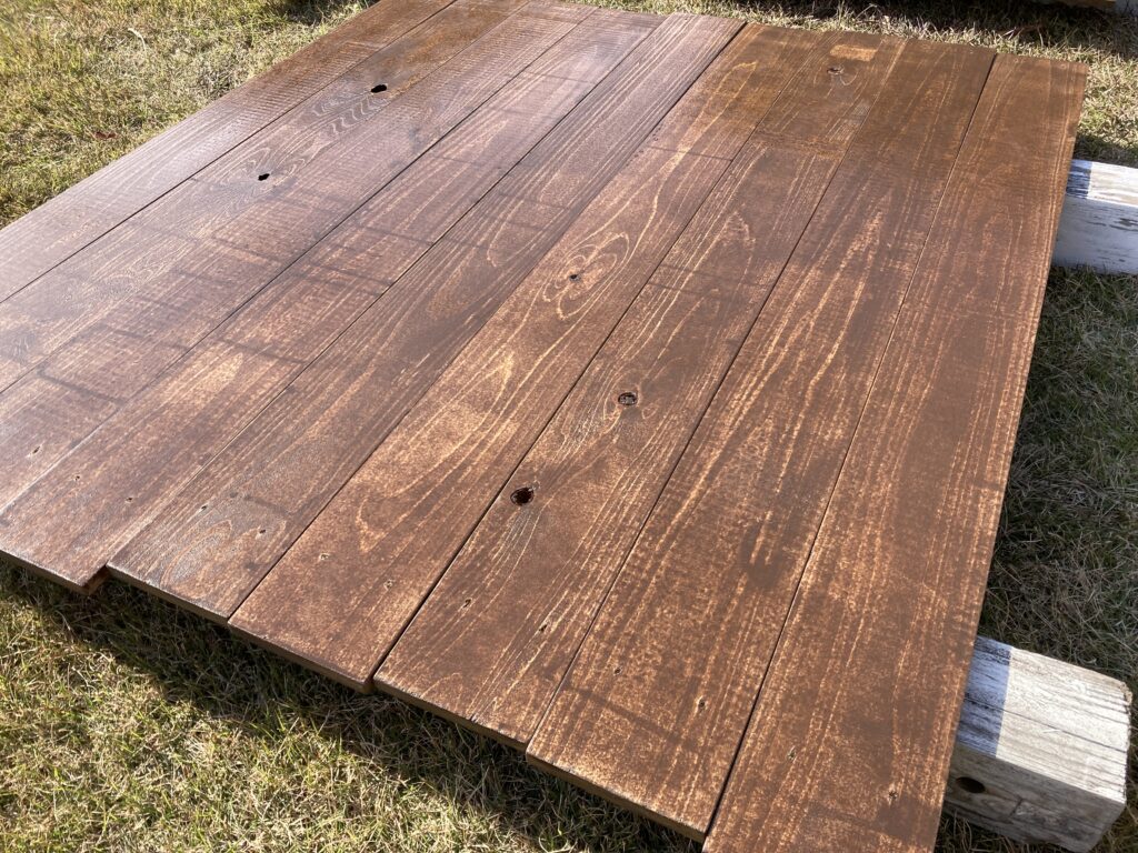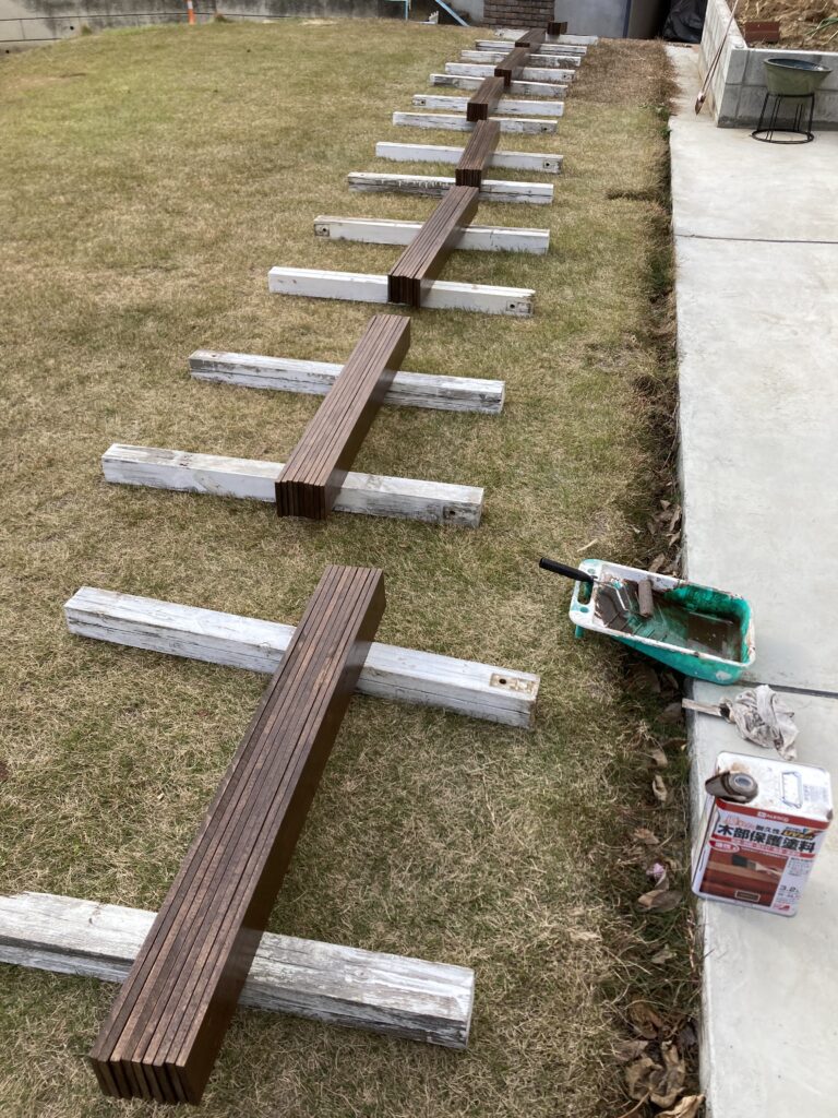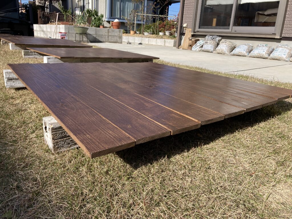 なるべく広げて全体乾燥待ちしています。檜ですが塗料はウォールナットで2度塗りすると結構濃いめになりました。1年も日に当たれば白っぽく退色してくると思いますので濃いめを選択しています。