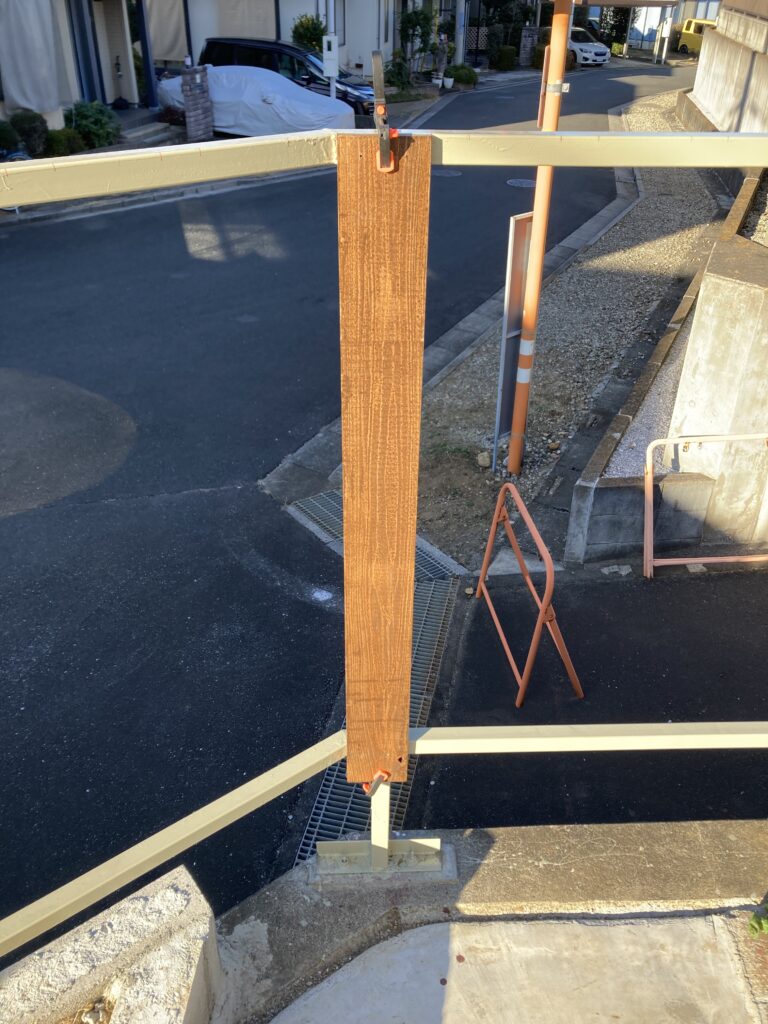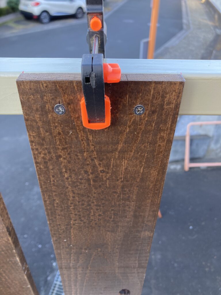 6番の柱部分に板材を当て上下を小型クランプで仮止めして問題ないか確認しました。ドリルビスなので本当に行けるのか直接打ち込んでみました。かなり力を入れましたがなかなか穴は開かず、穴が開いたと思ったら同時に板を持ち上げる方向に力が働く様です。1枚はなんとか取り付きました。