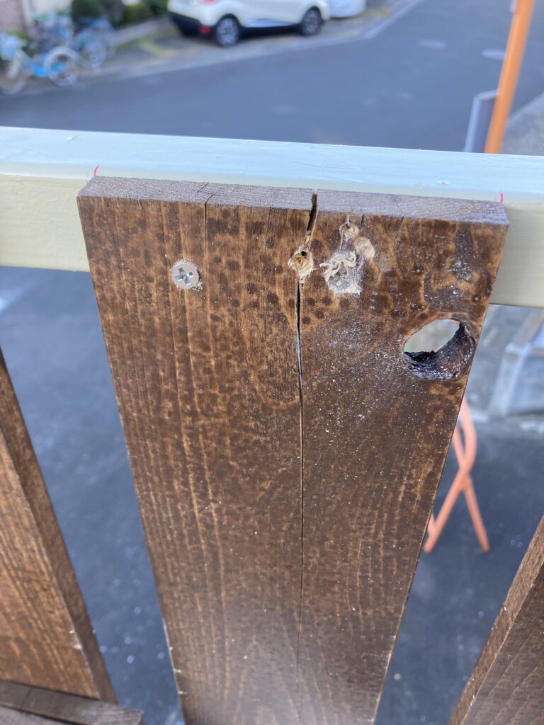 これは隣につけた2枚目です。1本目を固定し、2本目が板を持ち上げてくるので板が割れてしまいました。これは予定外の問題発生です。手間ですが下穴を開けないとダメですね。