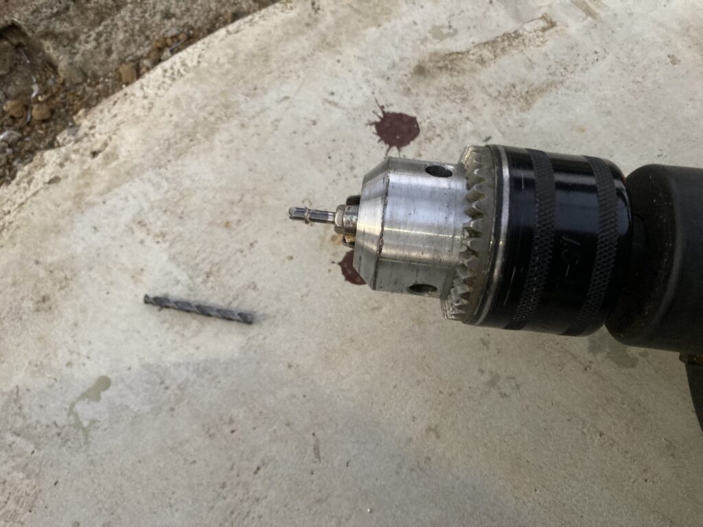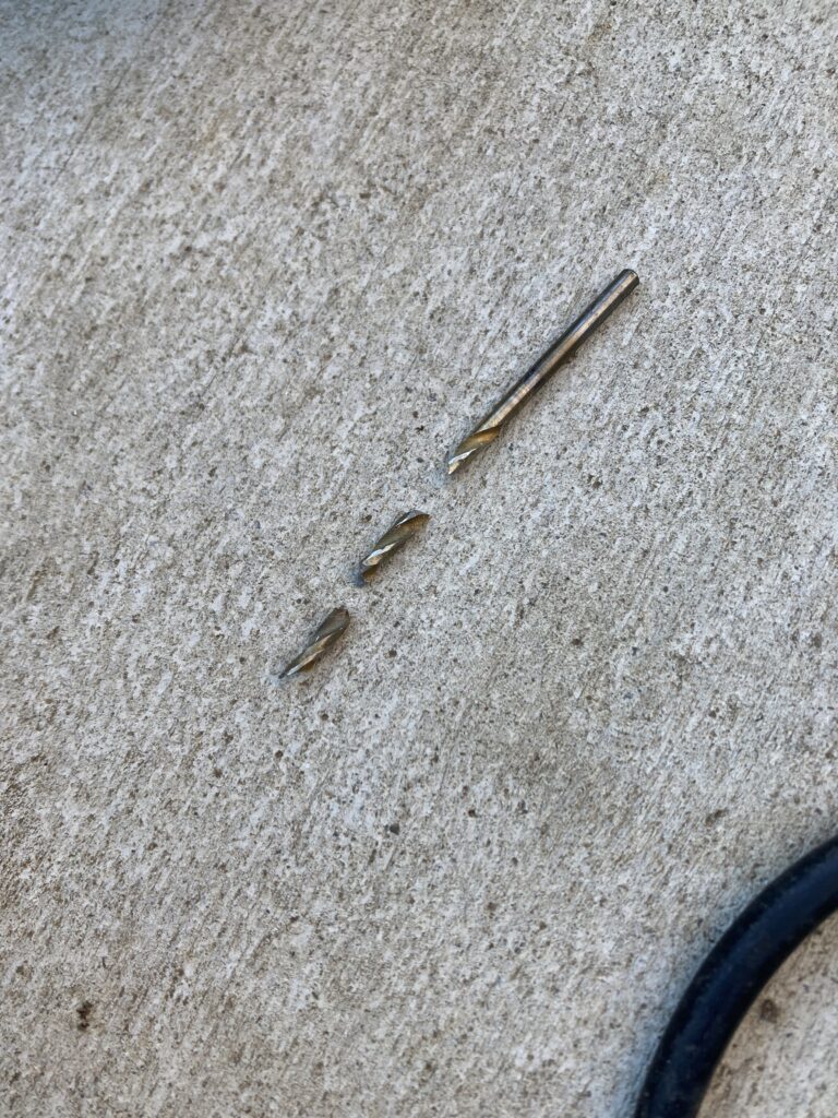 最後の下穴を開けた時、ドリルを抜く角度が悪かったようでドリル刃が折れてしまいました。本日3本目、ホームセンターで調達しないとドリル刃が間に合わなそうです。