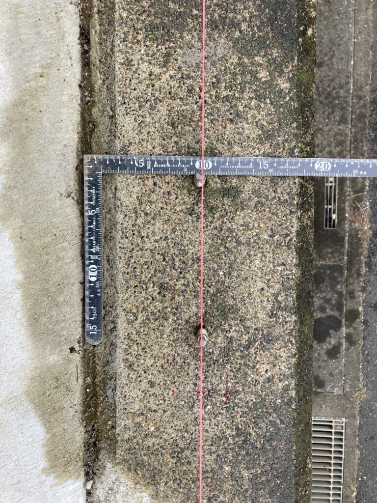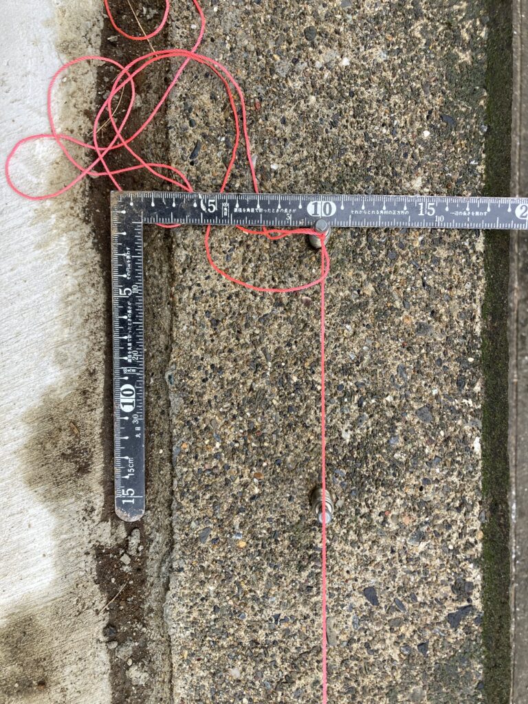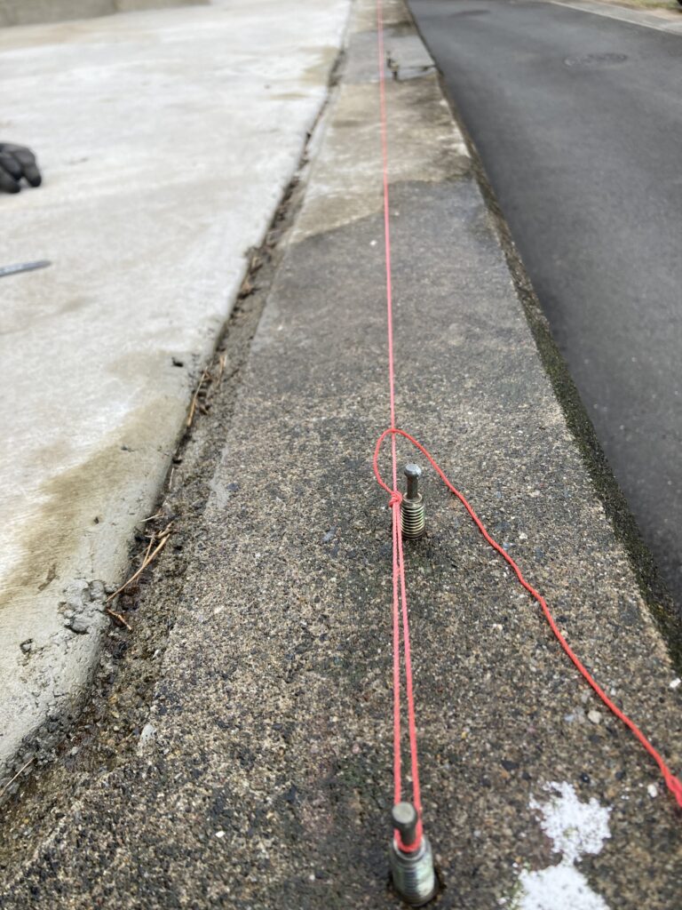 両端(両端は擁壁の中心)に糸を張って確かめると、やはり結構なずれがありました。