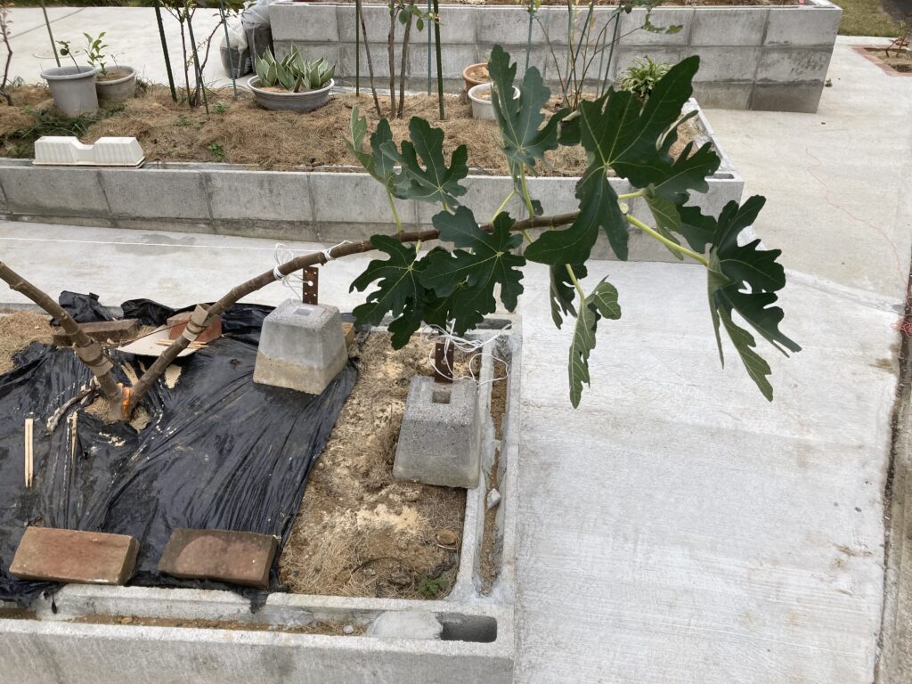 北風よけの塀作り、Lアングルベース仮設置まで、レイズドベッド3のイチジク再剪定