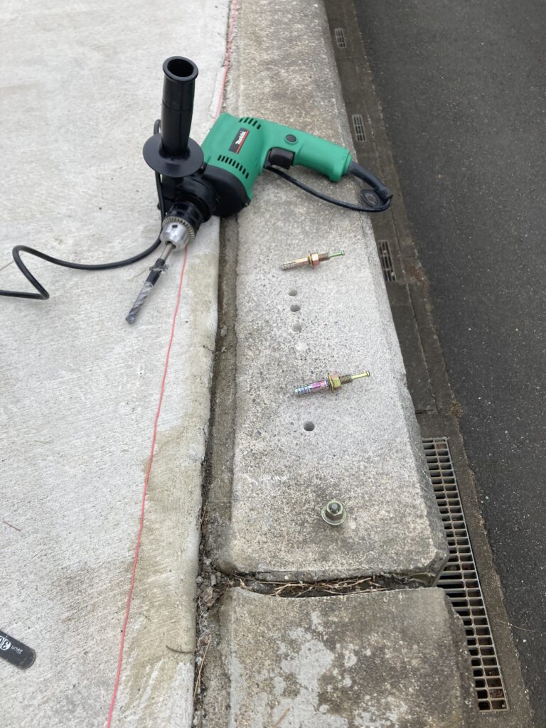3番のアンカー打ち直しです。アンカーはM10、振動ドリルに10.5㎜のコンクリート用の刃を着けて穴開けします。途中まで穴がなかなか開かなかったのですが、ドリルモードのままでした。振動モードに切り替えたらあっと言う間に穴開け完了。金属か石があると思って近くに開け直してしまい3つも穴が。。。