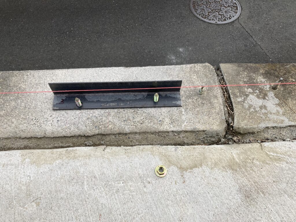 ベースプレートの設置予定場所をタワシで水洗いしました。表面の汚れ落としだけでなく、道路側に少し傾斜があるため、薄くモルタルで部分的に水平にしようと考えたためです。