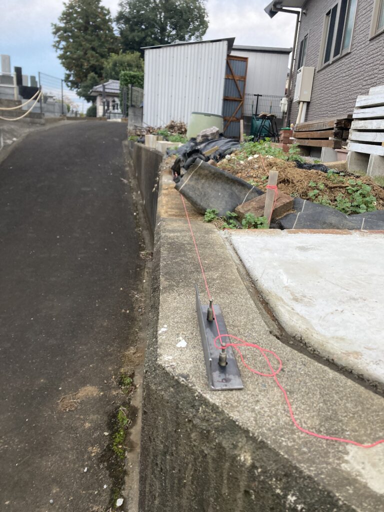 今回の設置位置では途中で2箇所の折れ曲がりがあります。北西角の端から南を見ると擁壁自体が撓んでいました。
