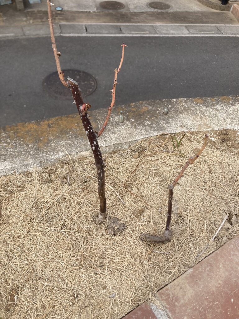 ご近所からいただいたバラです。冬に植え替えをしたせいか細い枝も枯れ込んでいます。土は栄養たっぷりにしてありますが春にどうなっているのか観察を続けます。