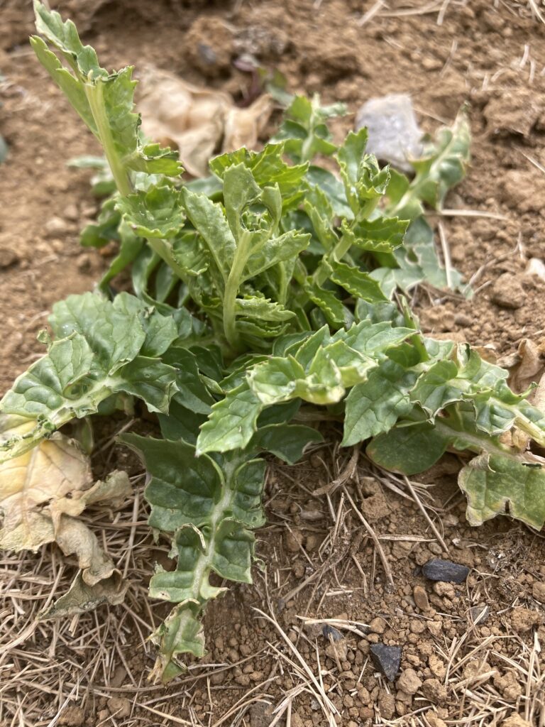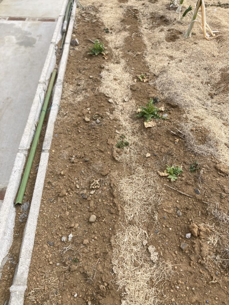 大根です。なんとか3株生き残っていますが、記録的な雨の少なさのせいか成長してくれません。