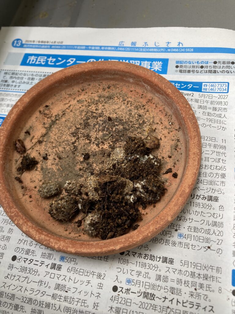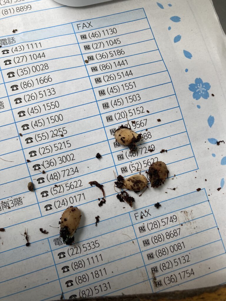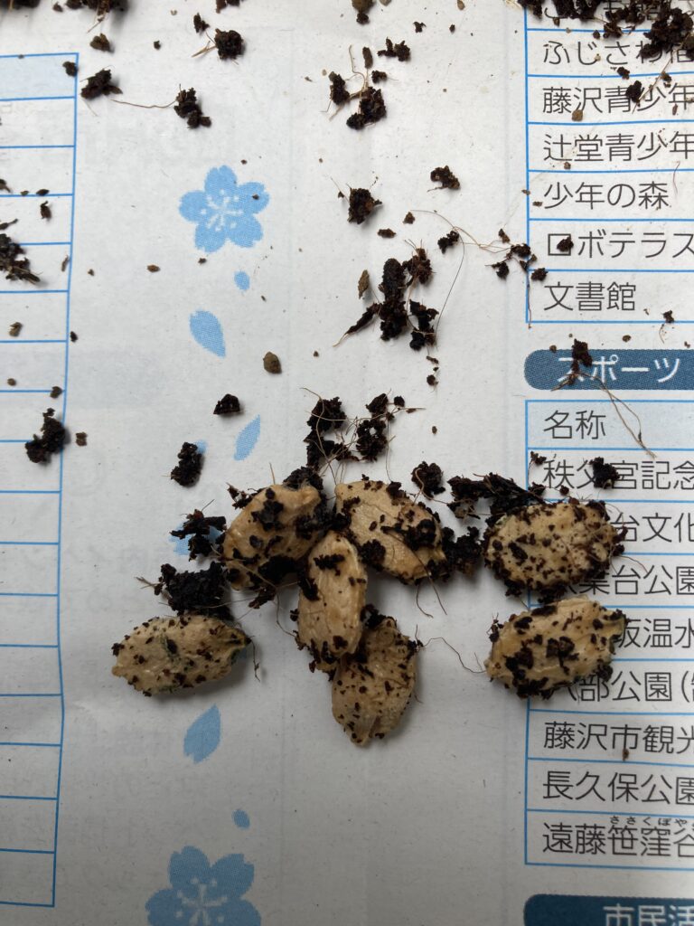 写真の種は枝豆ですがカビてぐにゃぐにゃになっています。これでは先がありません。用土は鹿沼土を半分くらい足して混ぜ直すことにします。