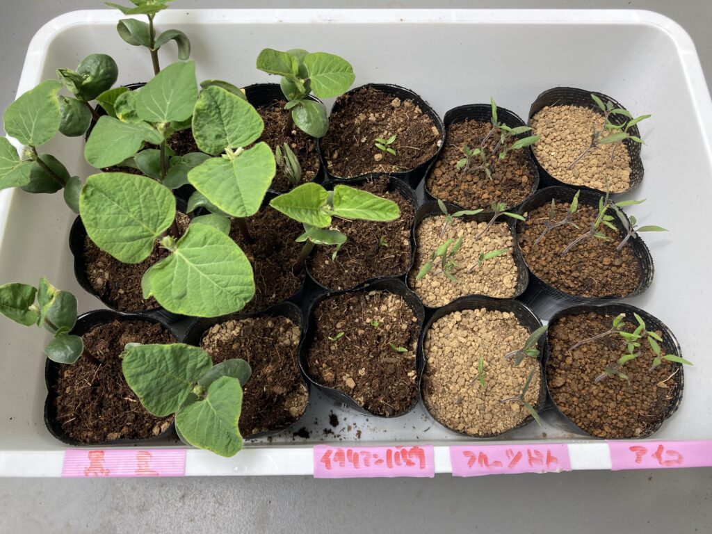 イタリアンパセリはヒョロヒョロの根っこでしたが、用土を変えてこちらのグループに移動します。黒豆の成長がすごいですね。これくらいになれば去年のように双葉を蟻に食べられないと思いますのでもう少ししたら定植できそうです。