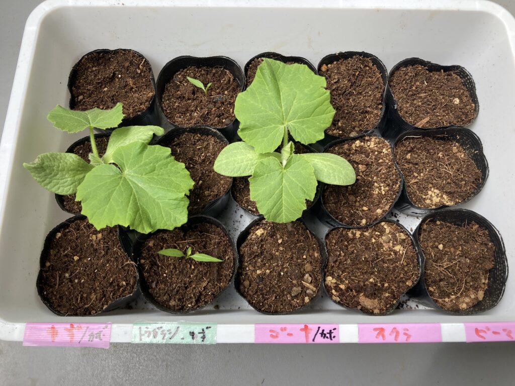 ポリの苗床で成長しているカボチャ、唐辛子もポリポットに新しい用土で植替えして育てることにしました。ピーマンは種が小さすぎて確認できないので、ピートモス用土のままひっくり返して鹿沼土を半分くらい足してからポリポットに戻しました。さてどうなるか見守っていきたいと思います。