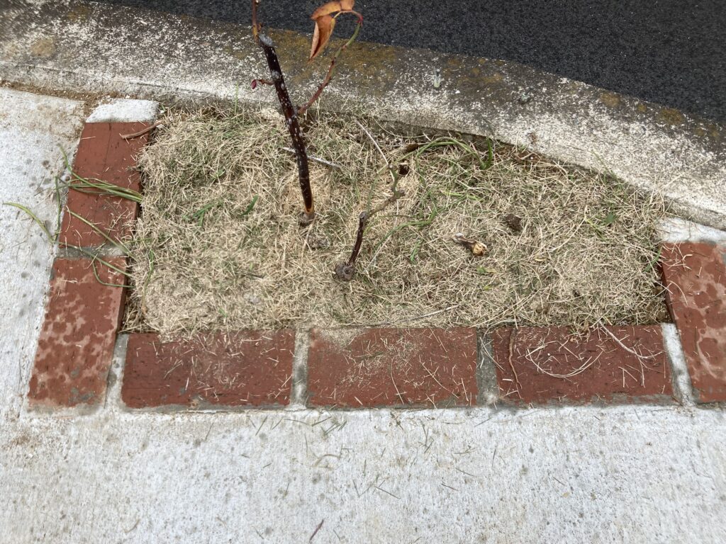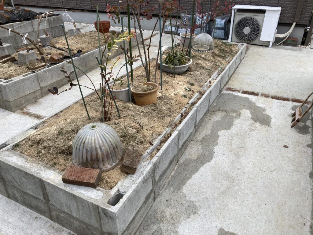 バラを植えた花壇にも刈りカスマルチと米糠です。バラは移設後に元気が無くなりました。