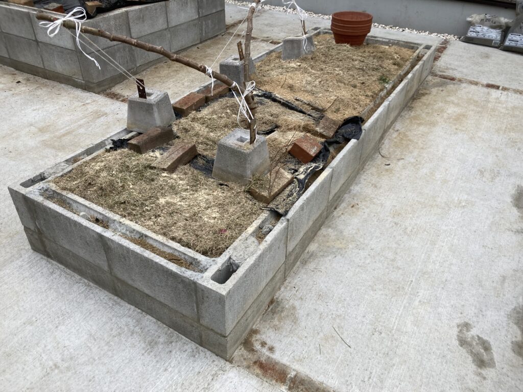 レイズドベッド3のイチジクにも刈りカスマルチで米糠撒き。誘引していますが、まだ紐がないと元に戻ろうとしますね。