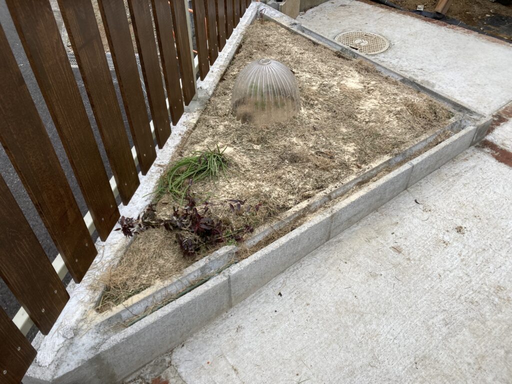 昨日芝生を刈りましたが、刈りカスを撒いてさらに米糠も撒きました。これはレイズドベッド1。野菜を作るのでふかふかの土を目指して。