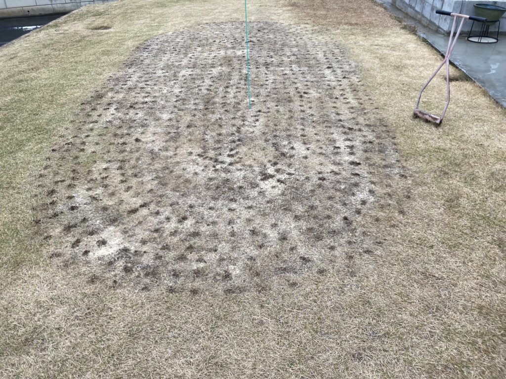 小雨降る中ですが、20数年前に刈った芝の根切りを使って穴あけしようと思いつきました。足で踏みつける感じで3個の金属が100㎜くらい地面に穴を開けられます。これを100㎜づつ踏んづけて移動してみました。古い芝の根が切られ、土の中に空気が入り、きっと芝生に何らかの良い変化があると思います。このグリーンには凸凹の修正、地面の硬い柔らかい部分の調整などが課題としてありますが時間かけてじっくりやってみます。夏前にはグリーンぽく仕上げてパター練習できるのが目標。雨が強くなってきたので本日は終了します。