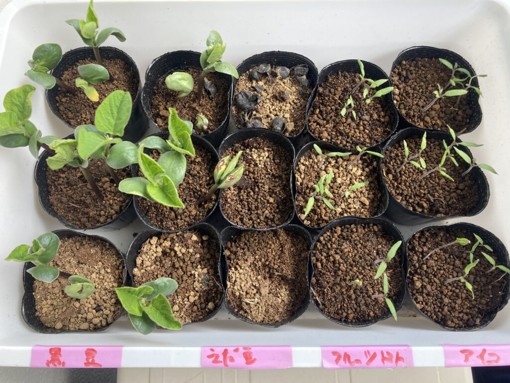 黒豆は双葉から本葉に、ミニトマトはたくさん芽吹きましたがその後の成長は見られません。ダイソーの枝豆は発芽せず。