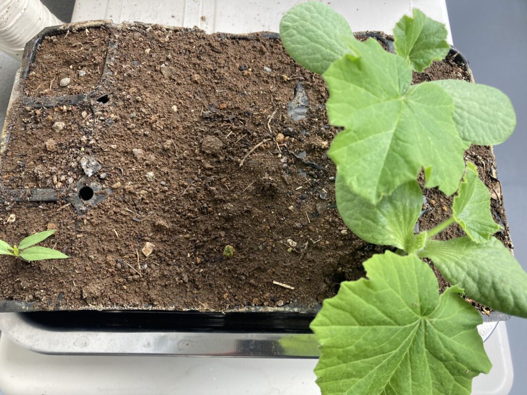 畑の土だけに種を蒔きましたが、カボチャの成長が早く、葉っぱも大きいのでもう少しで定植を考えます。そして1箇所に2本芽を出した唐辛子ですが、双葉が大きくなって来ました。