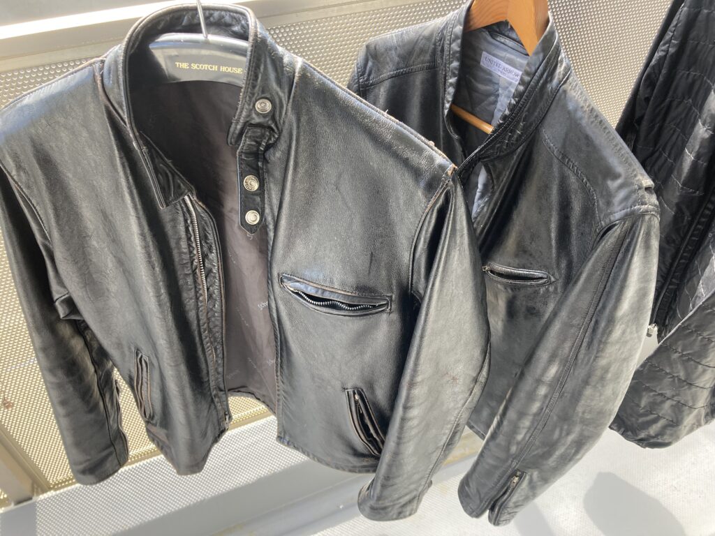 バイク(改造カブ)に乗るときに来ているレザージャケット2着です。2つとも中古で買いました。カビが生えないように首、袖、ポケット周りを中心に水拭きしてからレザーワックスを塗って(かなりベタつきます)少し干してから取り込みます。