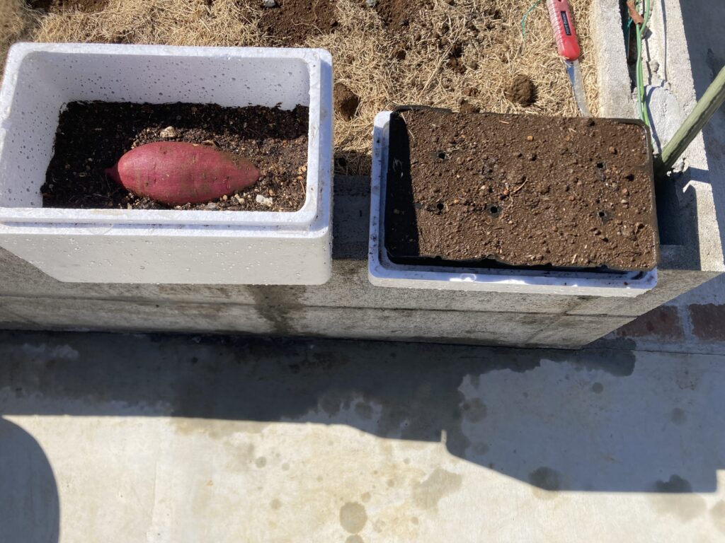 一緒に去年できたサツマイモ(ベニハルカ)の1つを芽だしできるかチャレンジします。これらは室内保管にて様子見。