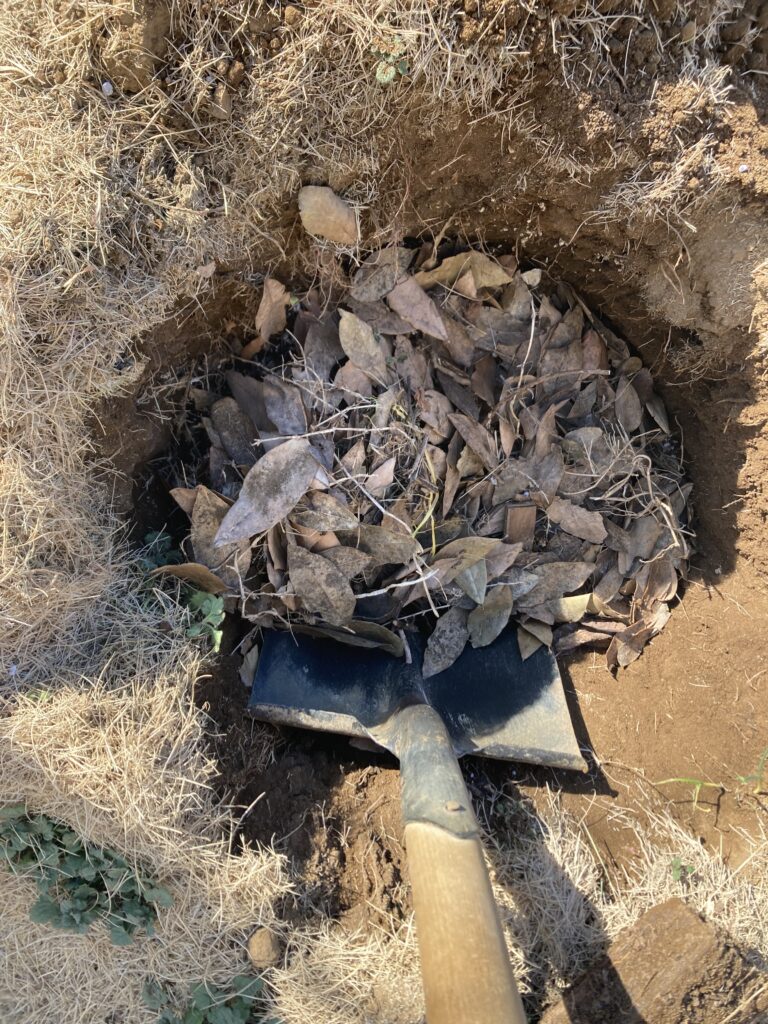 軽石を半袋、枯葉、化成肥料少々で混ぜます。