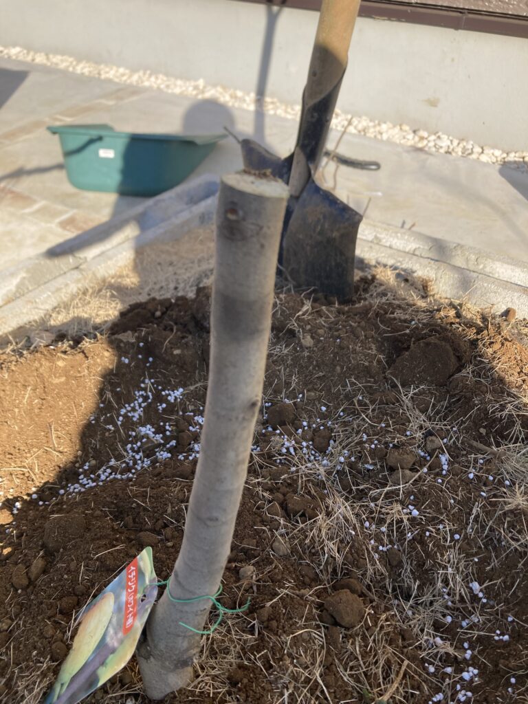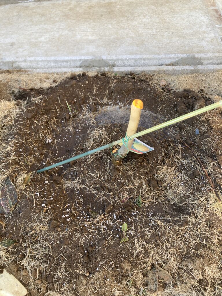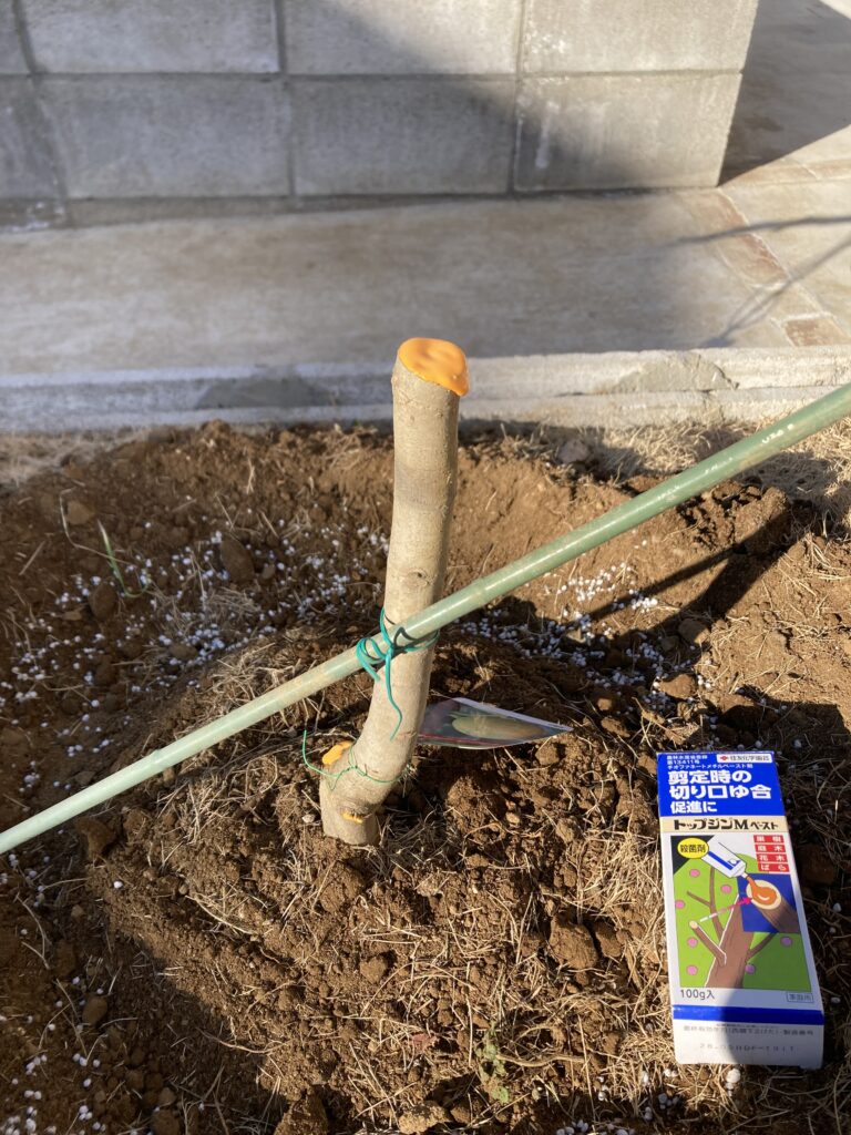 土をかけ、初期の風対策で支柱を立てて、切り口にはトップジンMを塗布しました。