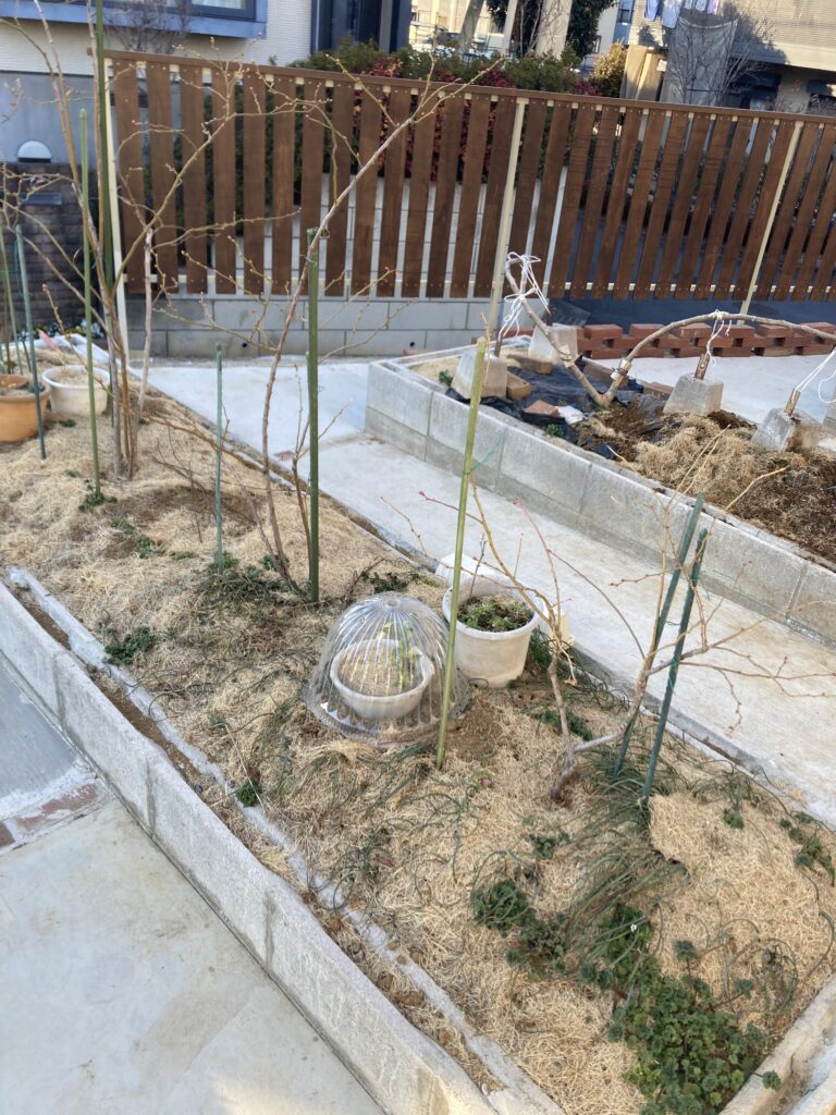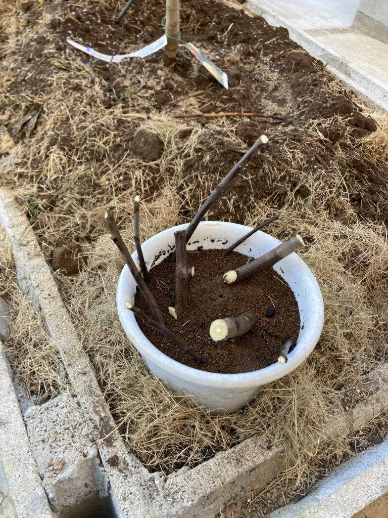 切った枝は3分割して鹿沼土の中に挿木してみます。上手く根が出たら鉢植えで管理予定。